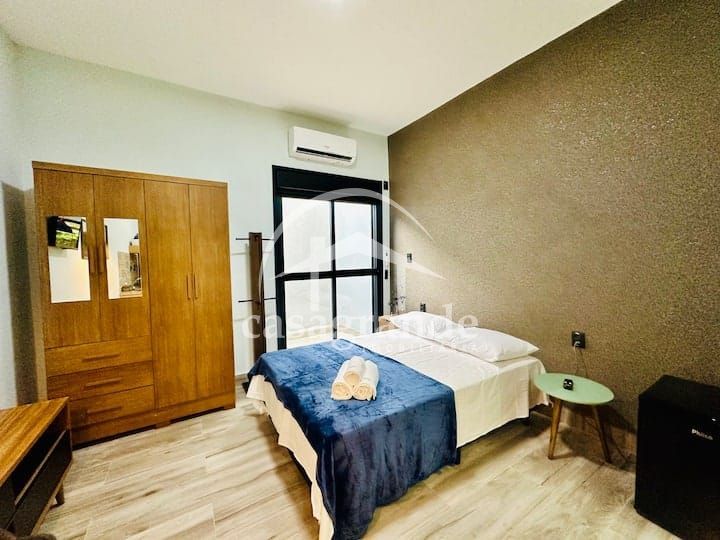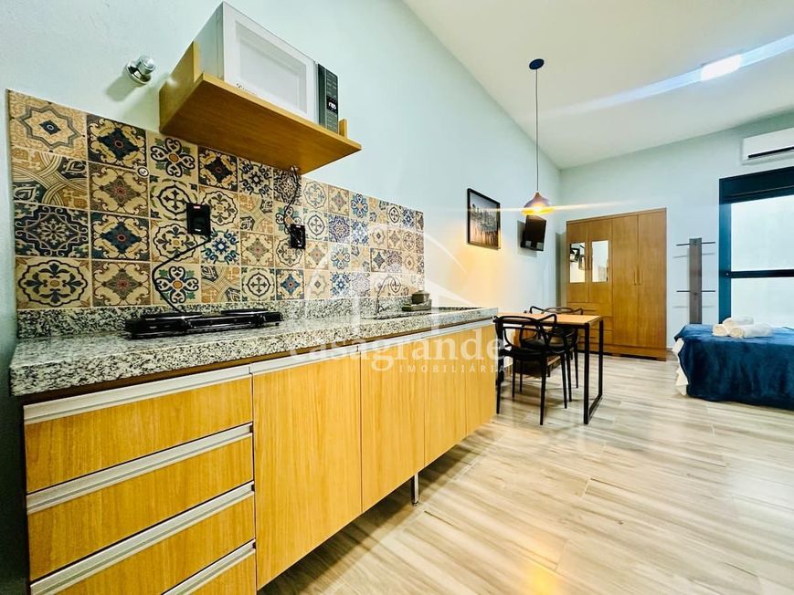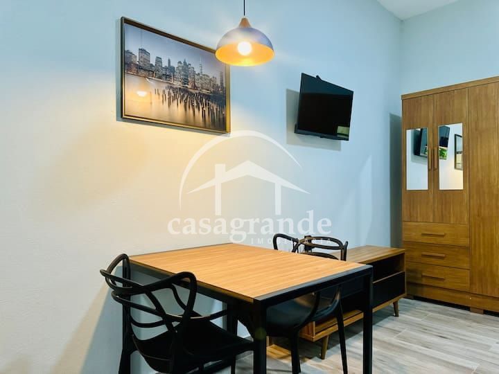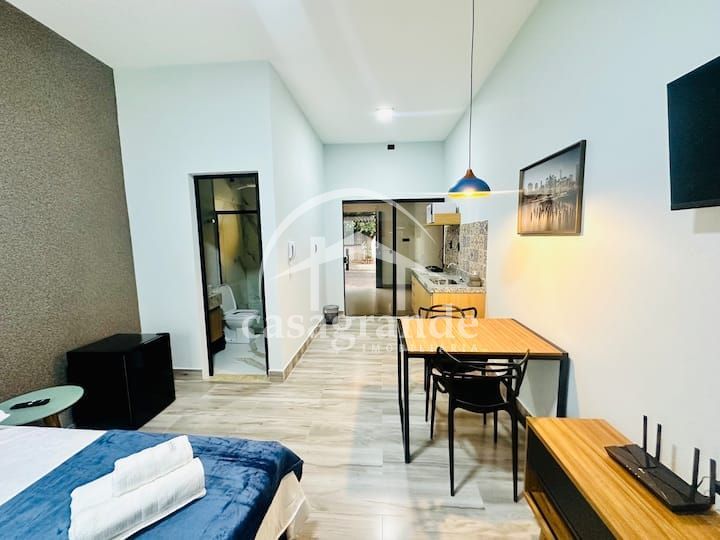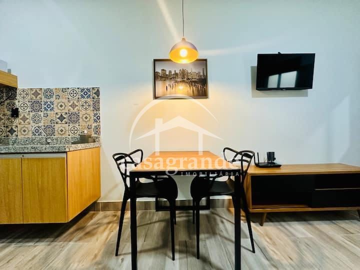 Kitinete mobiliada disponível para locação no bairro Minas Gerais, 1 quarto sendo 1 suíte com ar condicionado, suíte contém armário, espelho e box em blindex, cozinha com armário sob a pia, lavanderia e uma vaga de garagem coberta e portão eletrônico. Incluso energia, água e internet.
