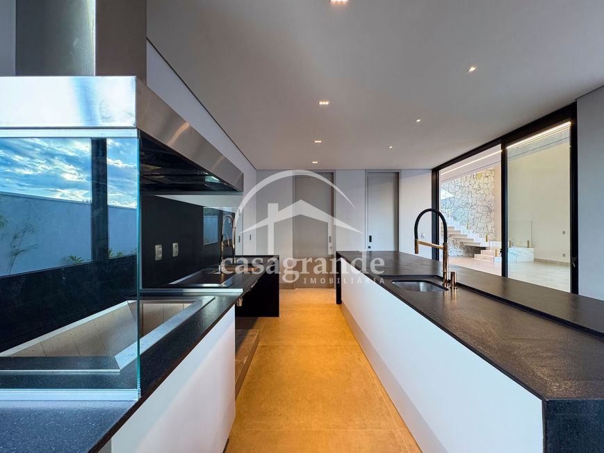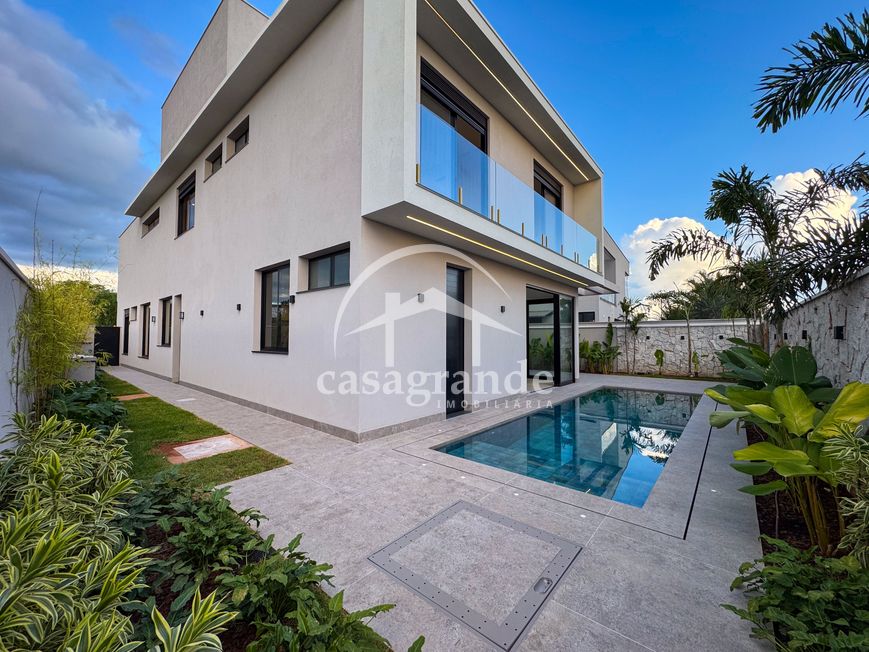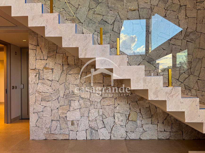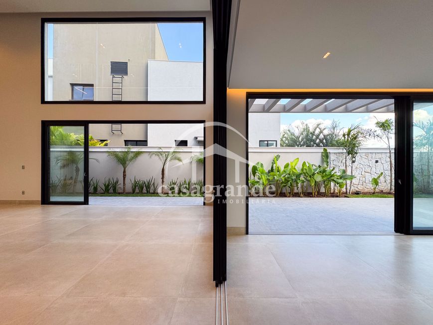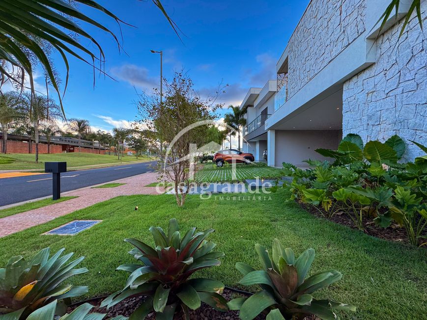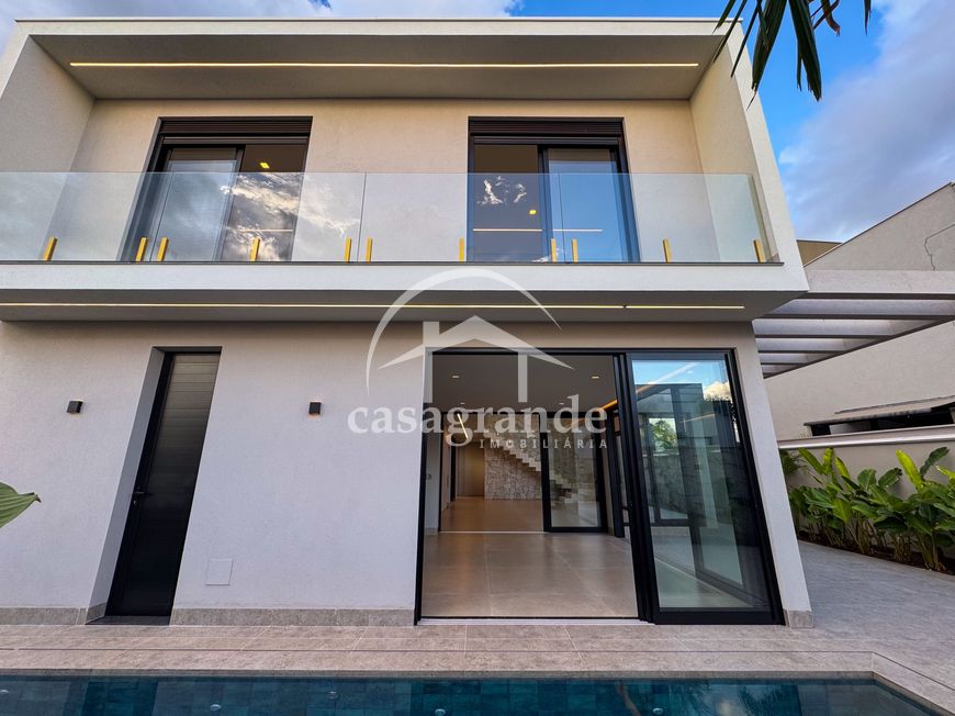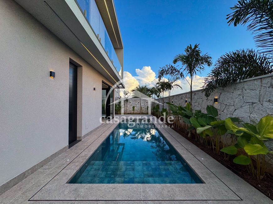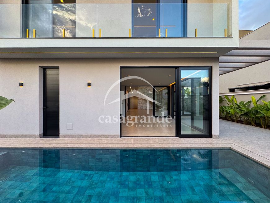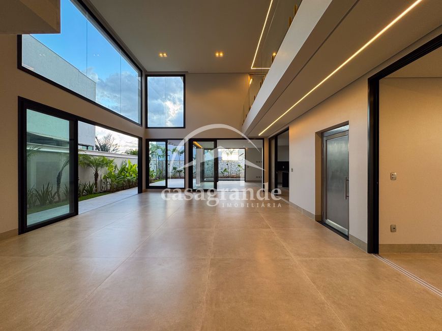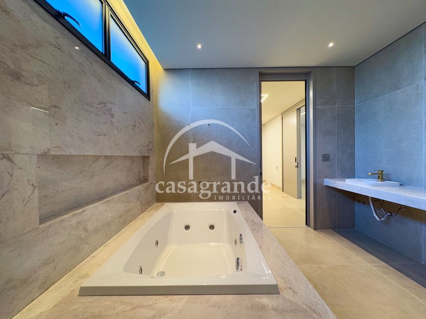 Casa alto padrão 1° piso: Sala multiuso, banheiro social, sala de tv, ampla sala de estar e jantar integradas com pé direito duplo, lavabo, cozinha, área gourmet, área de serviço com entrada interna e externa e elevador. 2° piso: 1 suíte Master com closet, sacada privativa e banheiro com banheira, 3 suítes adicionais, todas com excelente iluminação natural e ventilação, sendo 2 com sacadas. Área externa piscina aquecida com hidromassagem e banheiro de apoio. Condomínio oferece piscina adulto com raia de 25m, quadra de tênis epoliesportiva, salão de festa com espaço gourmet, fitness Center by Reebok, mais de 145 mil m² de áreas verdes, clube com mais de 19mil m², espaço para caminhadas, praças e parques infantis, natureza preservada, segurança 24 horas.