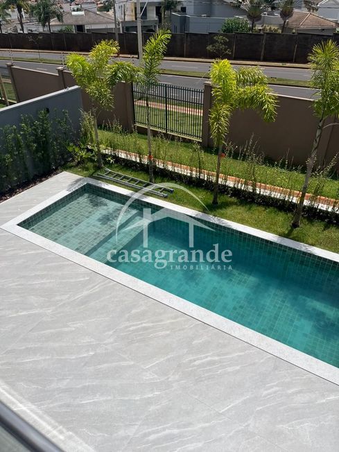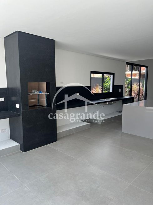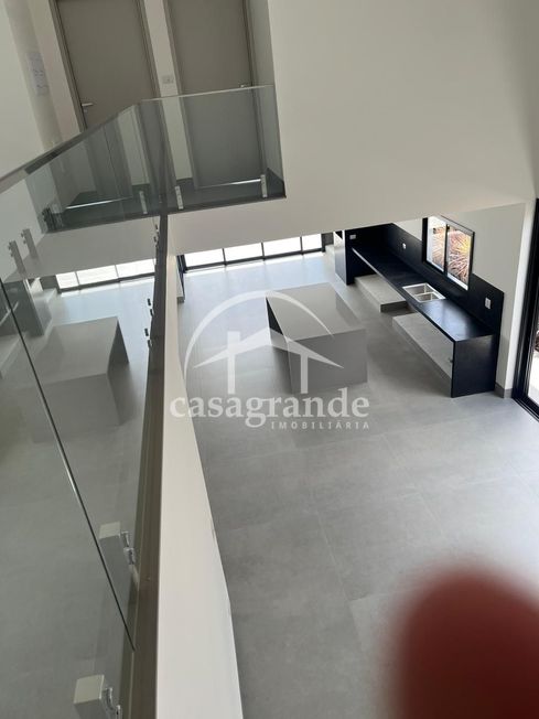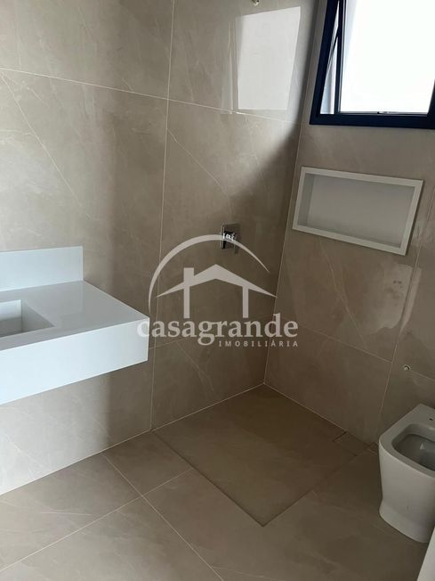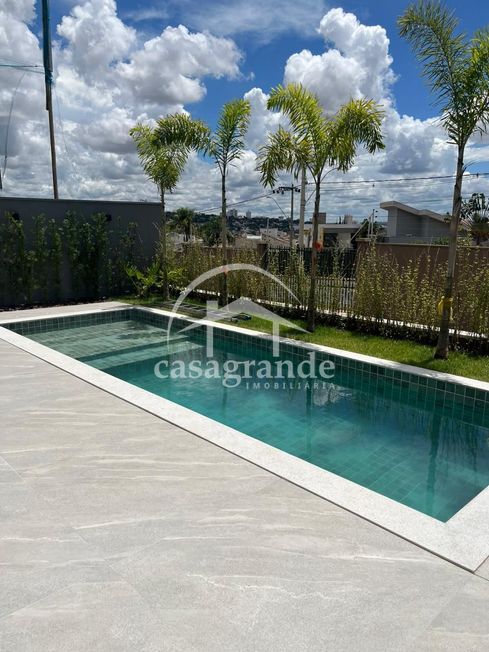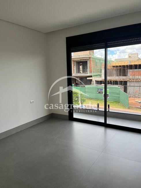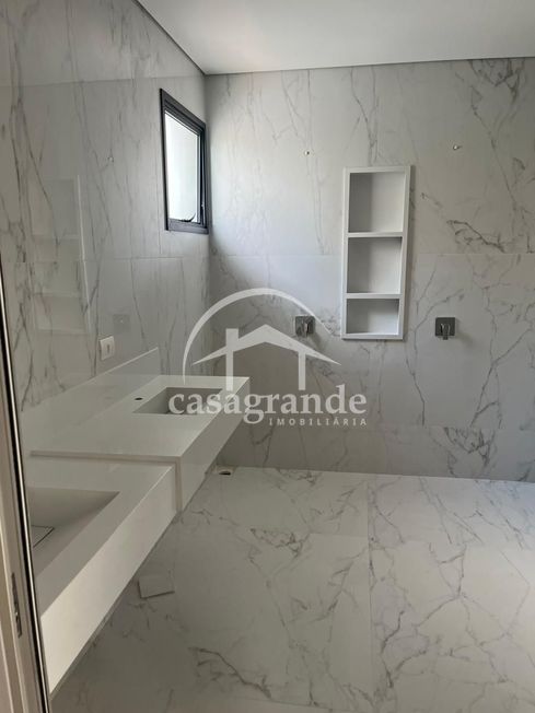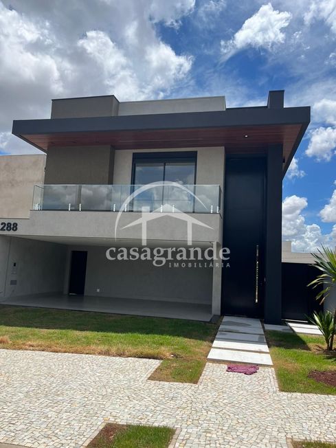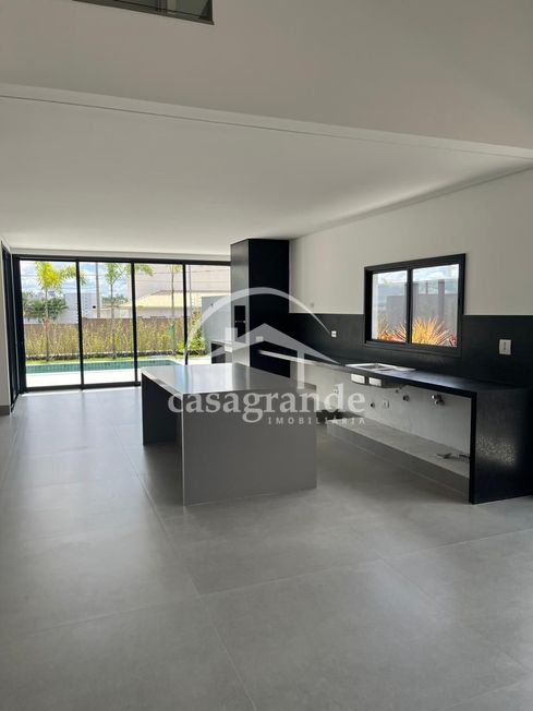 Casa em condomínio com sala com pé direito duplo, lavabo, quatro quartos sendo todos suítes, banheiro, cozinha integrada com espaço gourmet, área de serviço, piscina, aquecedor solar, espaço para elevador, três vagas de garagem cobertas.