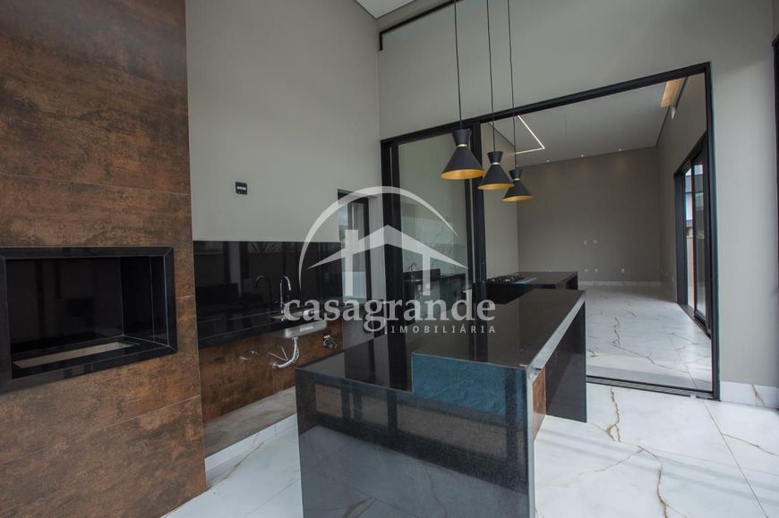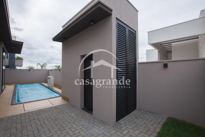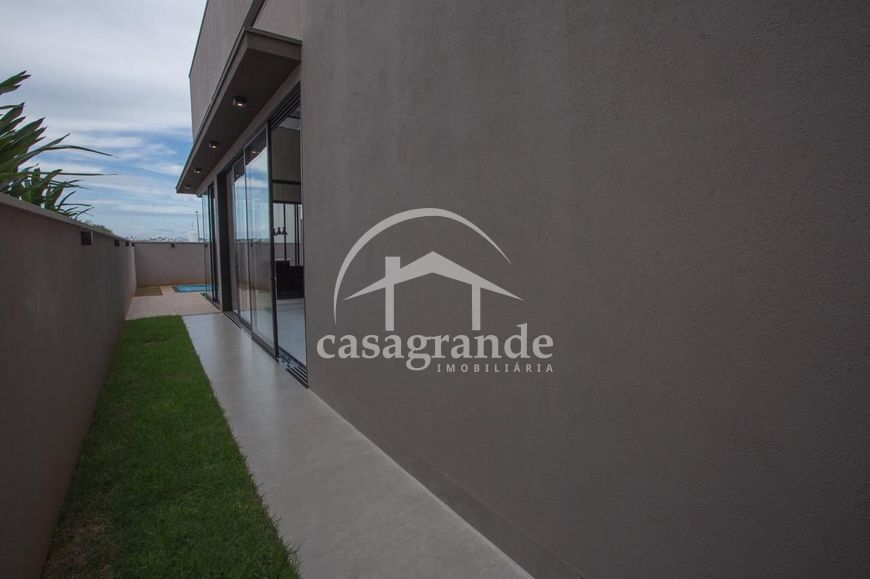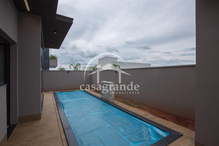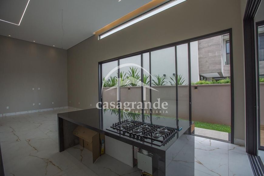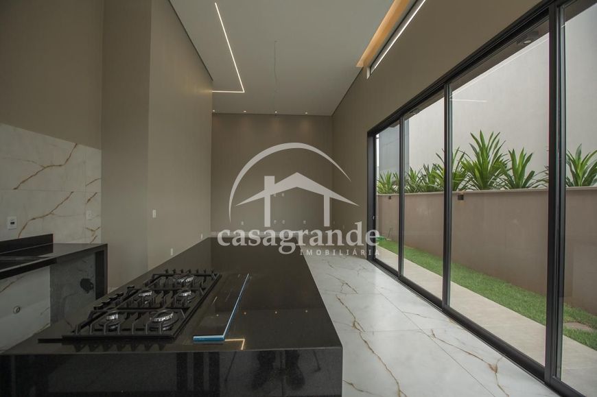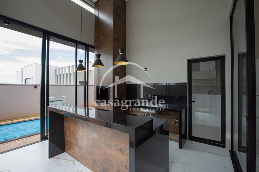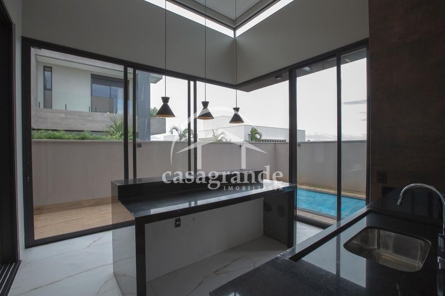 Sala em 2 ambientes com pé direito duplo, lavabo, 3 quartos, sendo 1 suíte com porta de correr e persiana automatizada, cozinha integrada com área gourmet, área de serviço, espaço gourmet com piscina aquecida e banheiro exclusivo, aquecedor solar, 4 vagas de garagem. Área construída de 233 m², área do terreno 467 m². Condomínio oferece espaço gourmet, piscina, playground, quadra poliesportiva, quadra de tênis, salão de festas. Segurança cerca elétrica, câmeras de segurança e portaria.