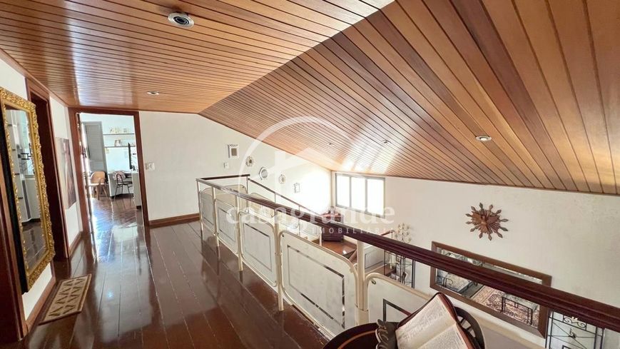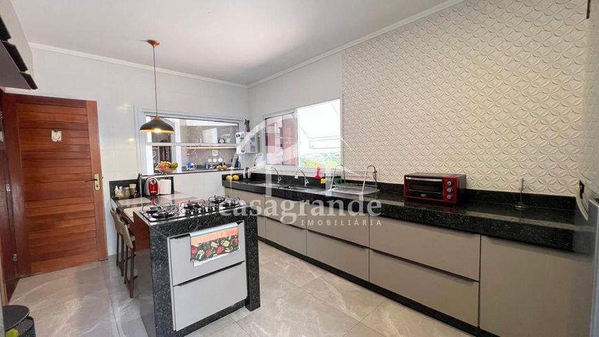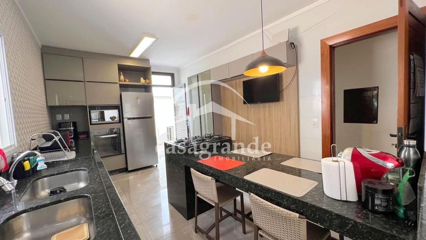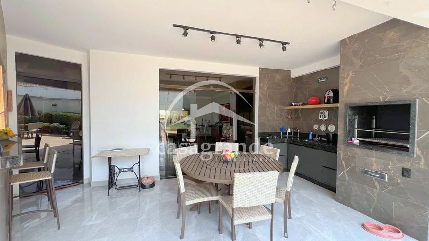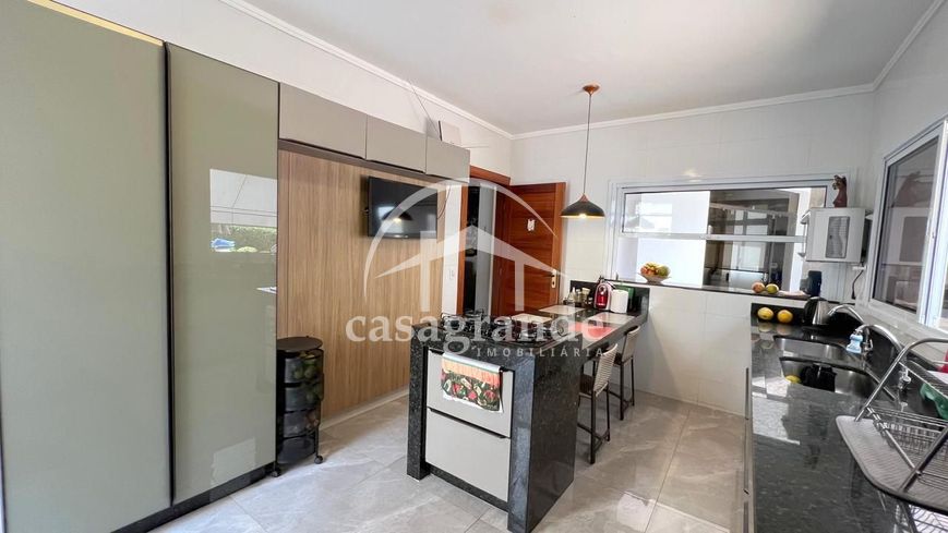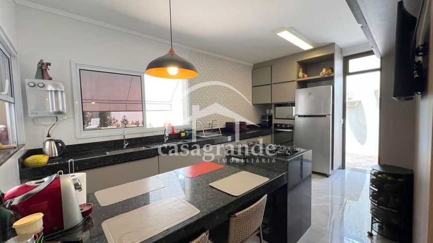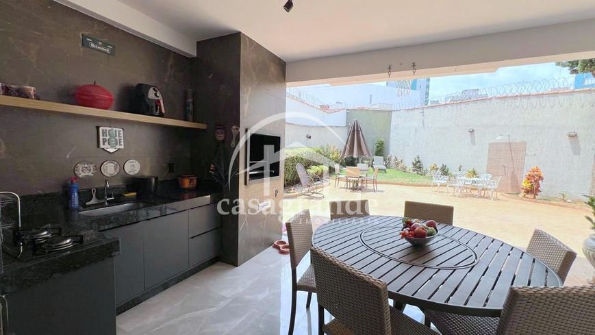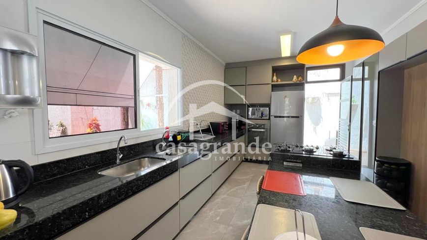 1° Piso sala em 2 ambientes com sacada, sala de tv, mini bar, lavabo, cozinha com bancada, cuba dupla e armários planejados. 2° piso: 4 quartos sendo 2 suítes e 1 semi-suíte, a máster com sacada, closet, amplo banheiro e cuba dupla. Todos os quartos com planejados de madeira maciça. Piso inferior área de serviço, despensa, banheiro e 1 quarto, entrada de área de serviço e depósito. Varanda gourmet com churrasqueira, cooktop, ducha, e amplo quintal. Energia fotovoltaica de 12 placas, piso com pedra luminária ouro verde e taco de madeira maciça. 2 vagas de garagem. Área construída de 319,40 m², área de terreno de 368,50 m².
