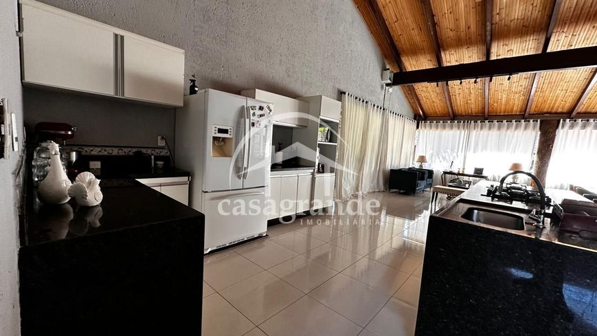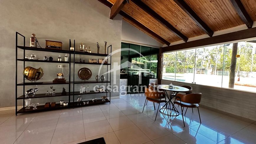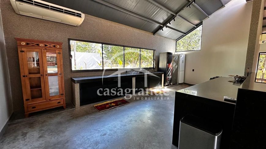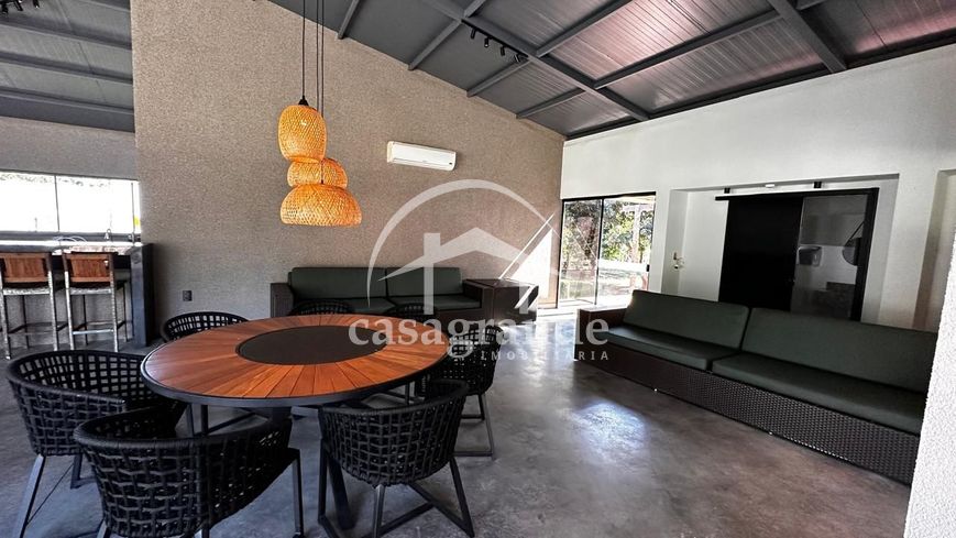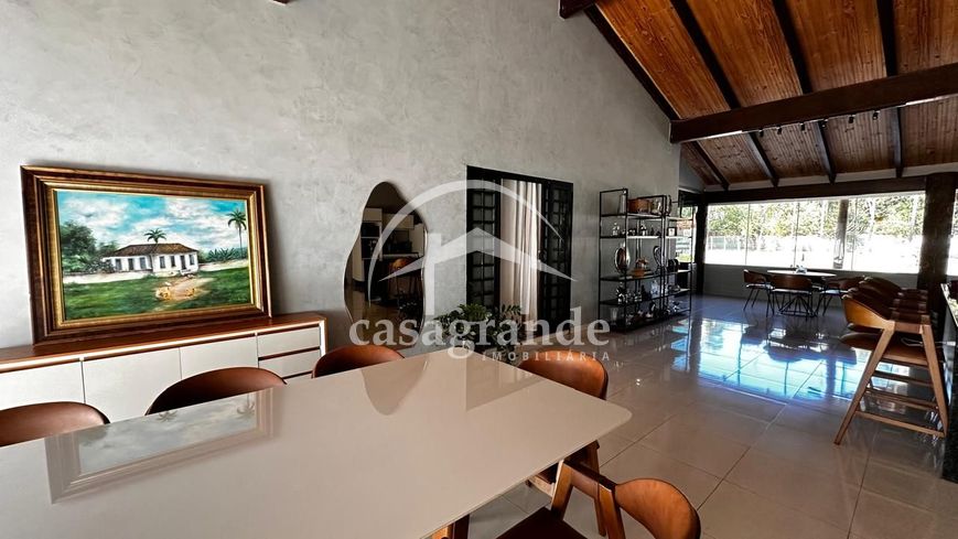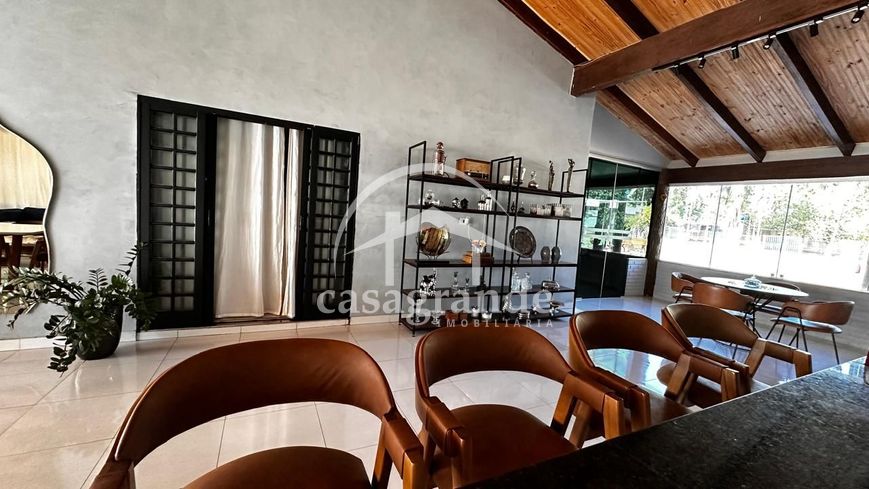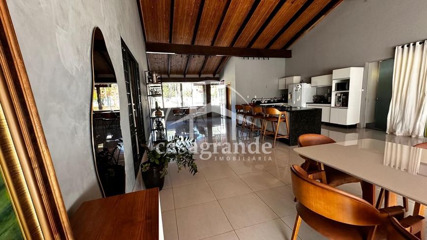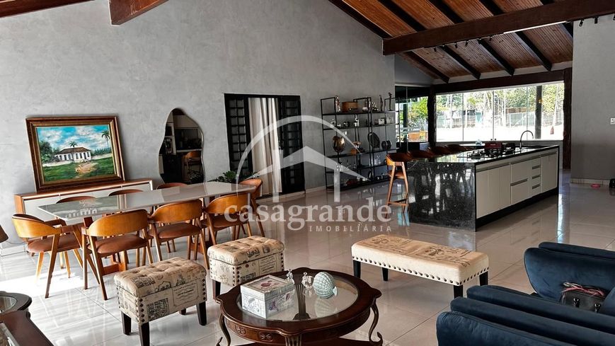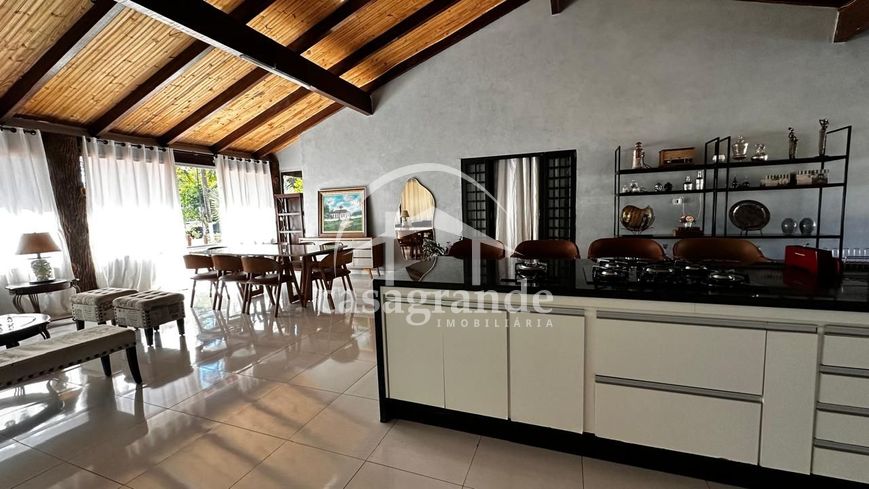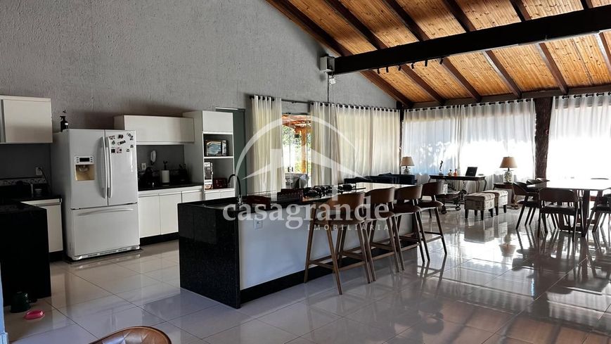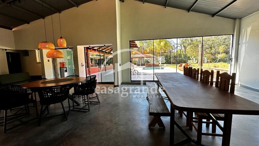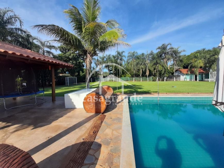 Sala em vários ambientes, piso em porcelanato, janelas em blindex, lavabo, cozinha completa com armários, sala de tv, 3 quartos, sendo, 2 suítes, todos com armários e ar condicionado, closet, lavanderia completa e varanda. Casa secundaria: Sala de tv climatizada, janelas em blindex, cozinha completa com armários, 2 quartos, 1 suíte e 1 banheiro social, ar condicionado, móveis planejados, lavanderia. Quarto externo: Acomodação para várias pessoas, banheiro e ar condicionado. Área gourmet externa climatizada: Cozinha completa com armários, churrasqueira, banheiro, piscina, campo de futebol, galinheiro, canil, capela. Área construída 604 m², área de terreno 5000 m². Condomínio com portaria 24 hrs, gramado, jardim, árvores frutíferas, poço artesiano, caixa de agua, irrigação automática, agua pressurizada, portão eletrônico e sistema de alarme.