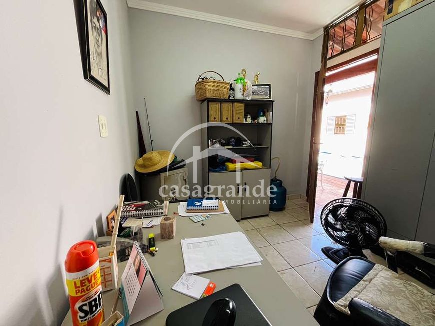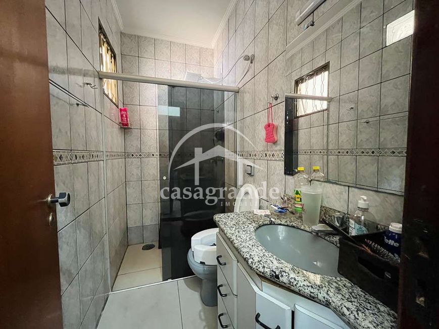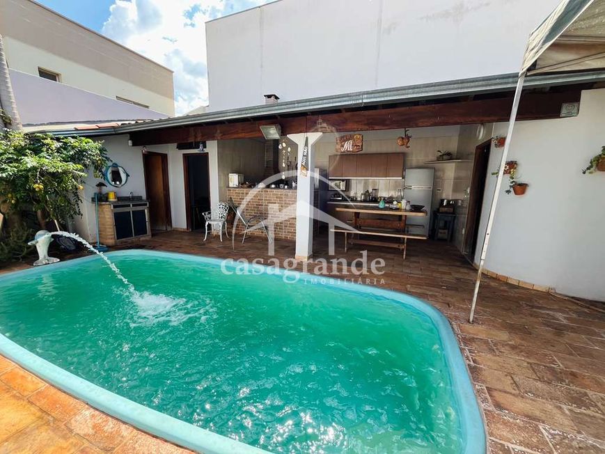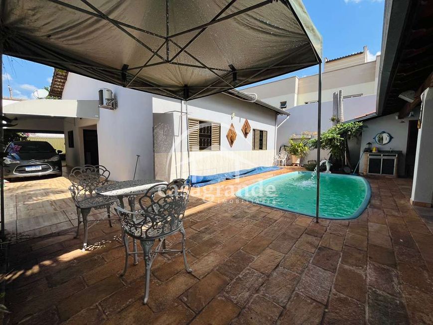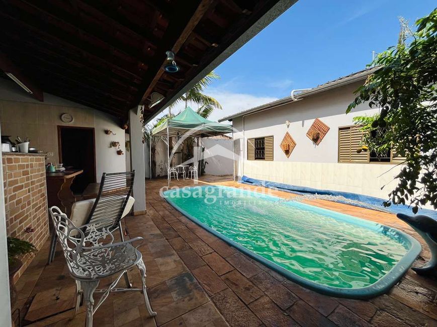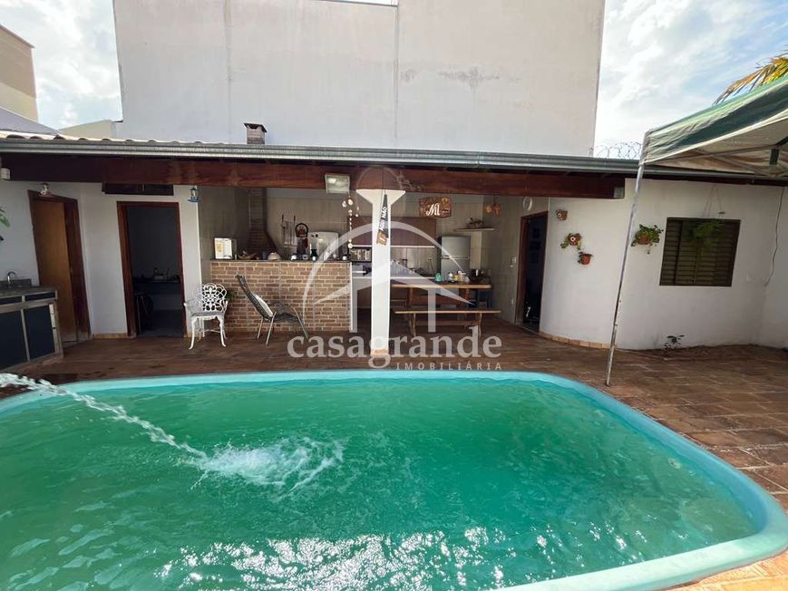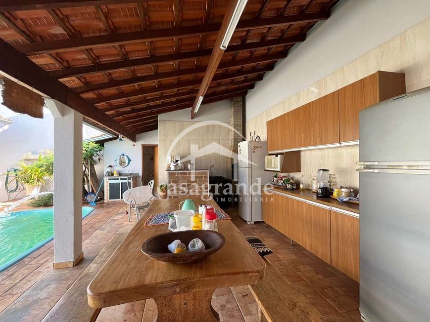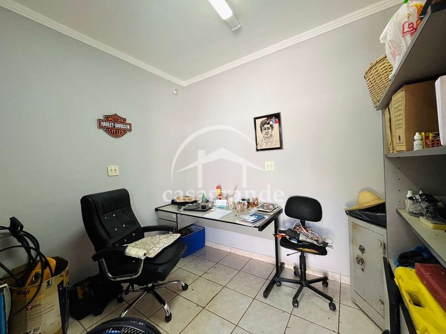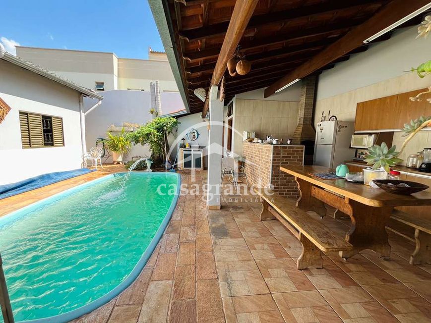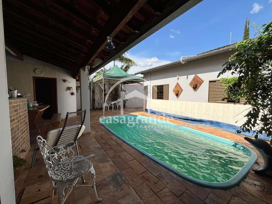 Casa térrea. Sala com estante planejada e ar condicionado, 03 quartos, sendo 01 suíte e uma semi suíte, 02 quartos com armários e ar condicionado, copa, cozinha com armários, edícula com um quarto, escritório e banheiro. Área de lazer com espaço gourmet com churrasqueira a carvão, balcão com pia, piscina, ducha. Garagem para 04 carros e jardim. Cerca concertina. Área construída: 195,84m², área do terreno: 300m².