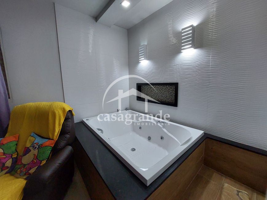 Sala em 2 ambientes, lavabo, 3 suítes, sendo a máster com banheira de hidromassagem, banheiro social, cozinha, área de serviço, varanda gourmet com churrasqueira, edícula com dois cômodos. 2 vagas de garagem. Área construída 220 m², área do terreno 240 m².