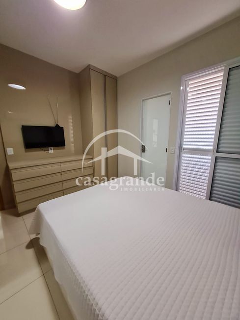 Suíte possui ar condicionado e sacada fechada com cortina de vidro.