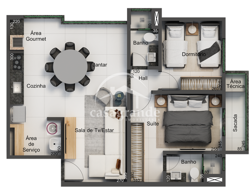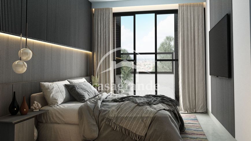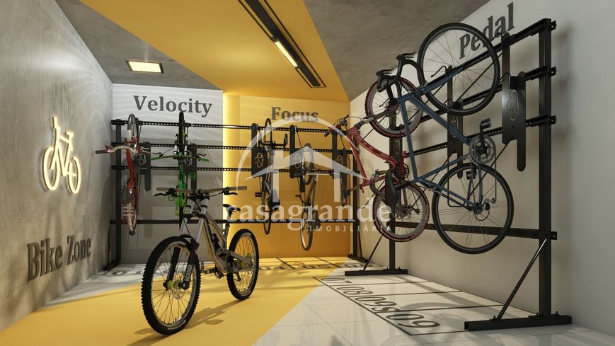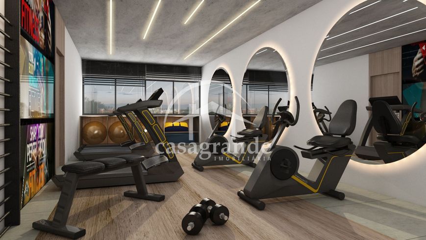 Apartamento com elevador, sendo sala em 2 ambientes, banheiro social, 2 quartos, sendo 1 suíte com sacada, cozinha gourmet com churrasqueira a carvão, área de serviço, 2 vagas de garagem. Área privativa 69,52 m². Porcelanato 90x90, pedras e pias em mármore São Gabriel, cubas e torneiras de inox, louças Deca, 3 pontos de ar condicionado, churrasqueira revestida em porcelanato, janelas e esquadrias em preto, portas e portais em madeira. Condomínio oferece espaço fitness, brinquedoteca e bicicletário.