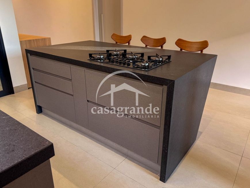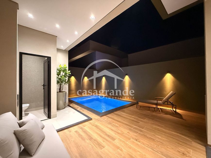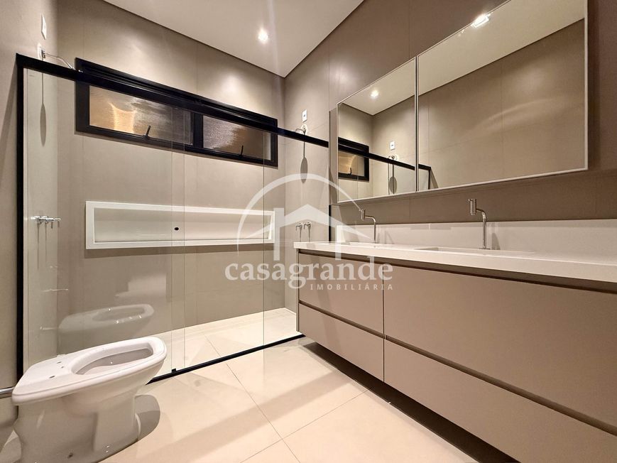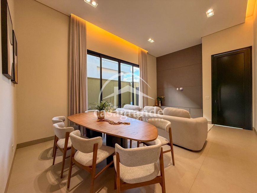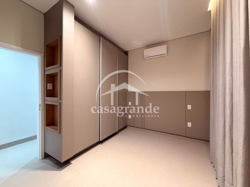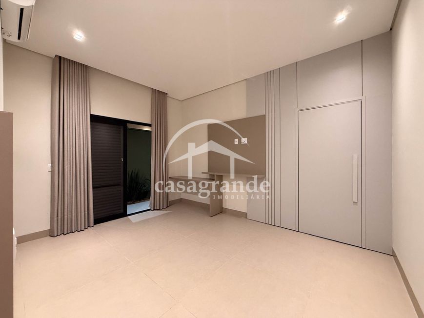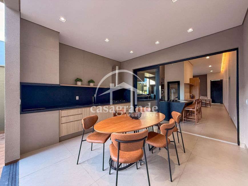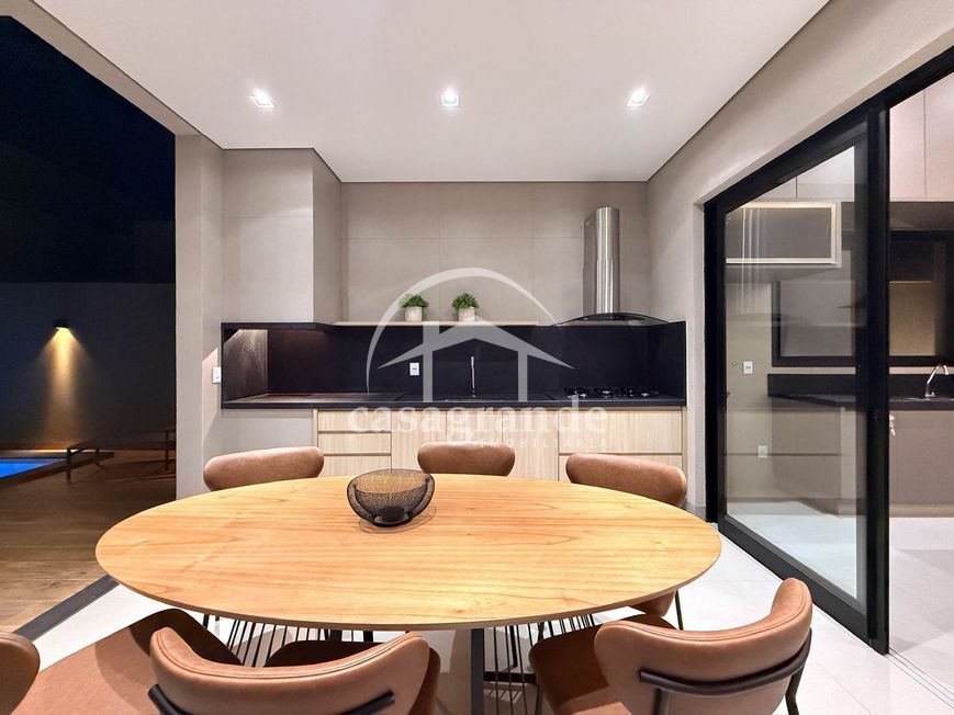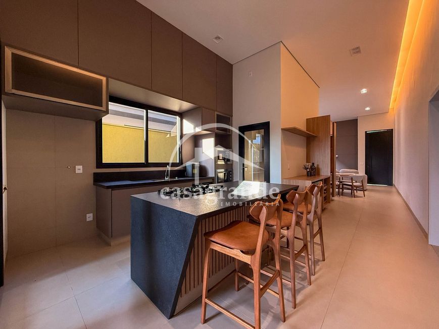 Casa térrea com móveis planejados, sendo sala em 2 ambientes, 4 suítes com ar condicionado, sendo a master com closet, cozinha equipada com eletrodomésticos, área de serviço e despensa, área de lazer espaço gourmet com churrasqueira, piscina aquecida com hidromassagem, aquecedor solar para chuveiros, paisagismo completo com irrigação automatizada, 2 vagas de garagem. Área construída de 215 m², área do terreno 360 m². Condomínio oferece campo de futebol, quadra poliesportiva, piscina, playground, varanda gourmet. Portaria 24h.