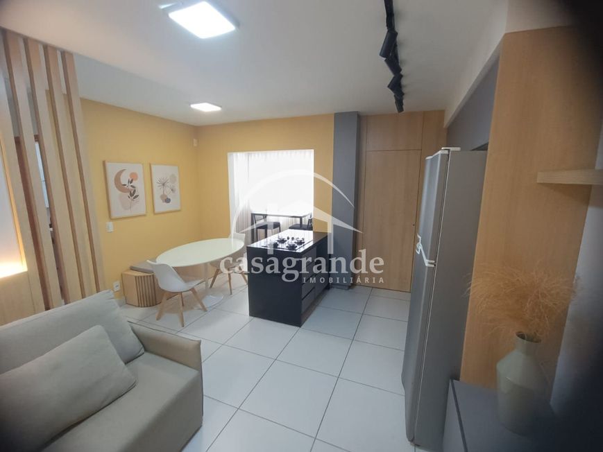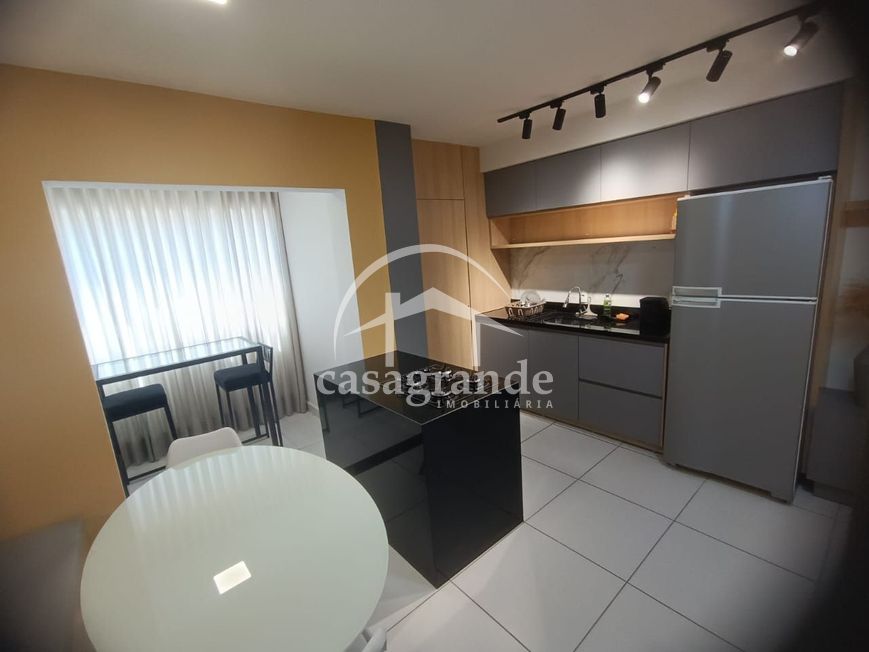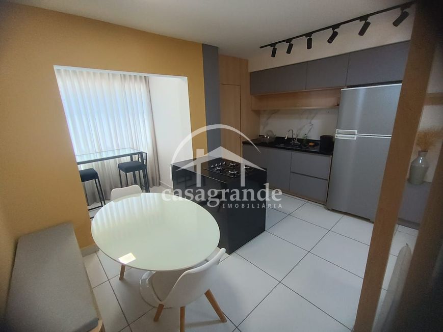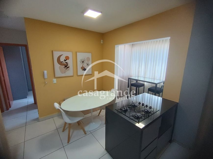 Apartamento moderno, piso em porcelanato sala em dois ambientes com cozinha integrada com ilha, dois quartos sendo um suíte, banheiro social, apartamento montado com fogão cook top armários na cozinha, quartos, banheiros, camas, dois elevadores, uma vaga de garagem coberta, salão de festa.